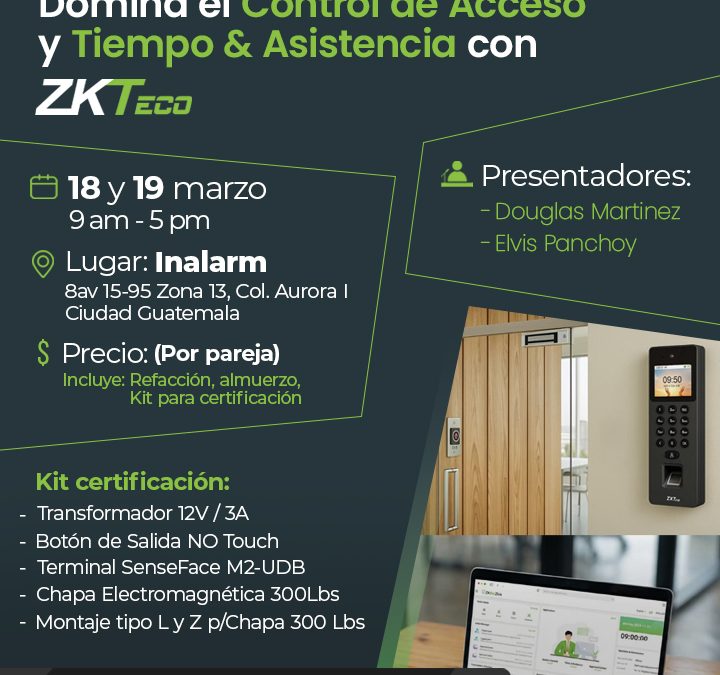 Certificación – Control de acceso y control de tiempo y asistencia by Carlos Quinteros | Mar 18, 2026 | Acceso, Tiempo y Asistencia | 0 comments ¿Cuándo? marzo 18, 2026 - marzo 19, 2026 9:00 am - 5:00 pm Add To Calendar Download ICS Google Calendar iCalendar Office 365 Outlook LiveProducto AccesoTiempo y AsistenciaInscríbete con nuestro encargado de línea:Alejandro Montenegro +502 4212-9421 Submit a Comment Cancelar respuestaTu dirección de correo electrónico no será publicada. Los campos obligatorios están marcados con *Comentario *Nombre * Correo electrónico * Web Guardar mi nombre, correo electrónico y sitio web en este navegador para la próxima vez que haga un comentario.